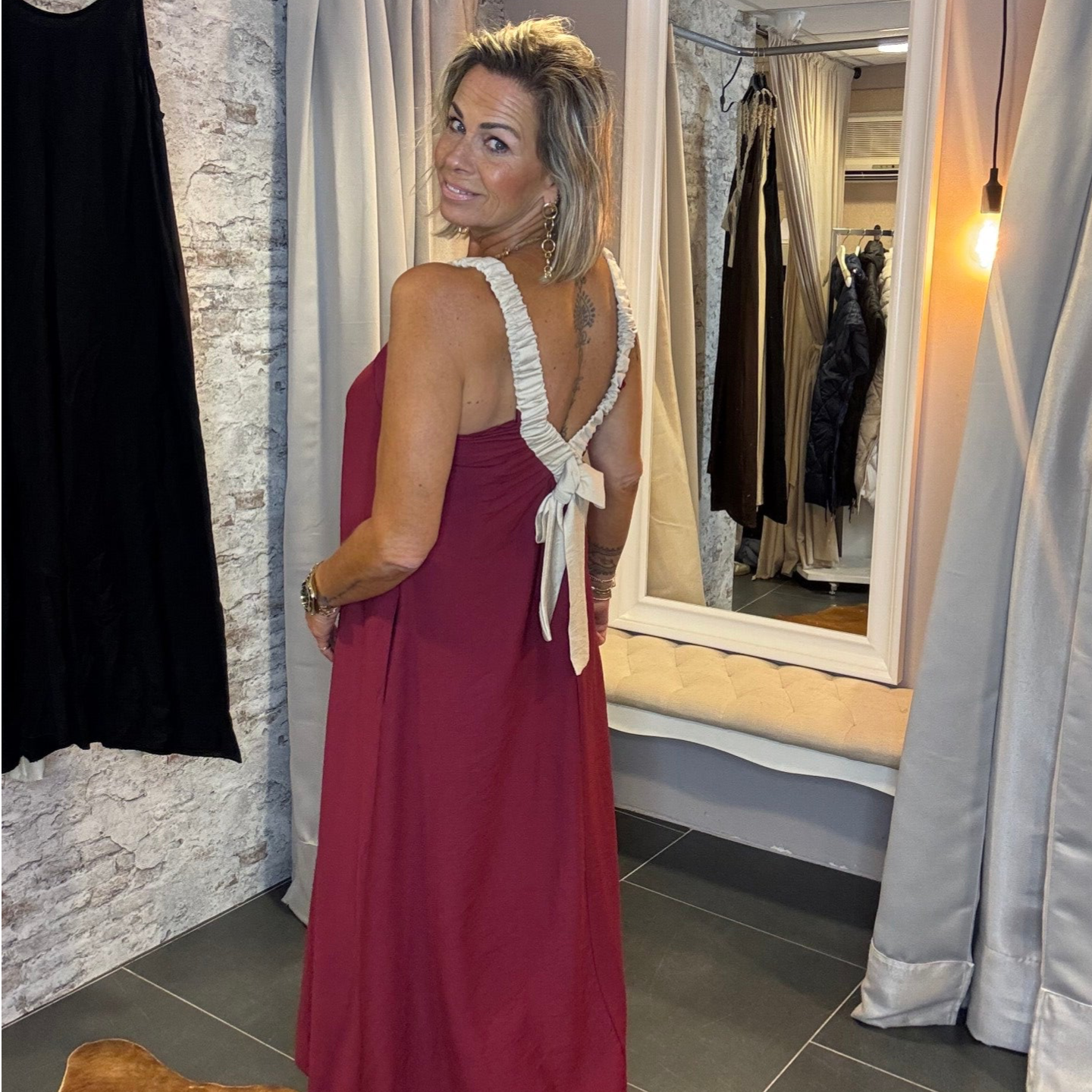 Deze prachtige jurk verrast met een adembenemende achterkant: een diepe V-hals, afgewerkt met een elegante strik en een contrasterende beige bies voor nét dat extra detail. En het beste? Je kunt er gewoon je bh onder dragen – die blijft mooi uit het zicht.