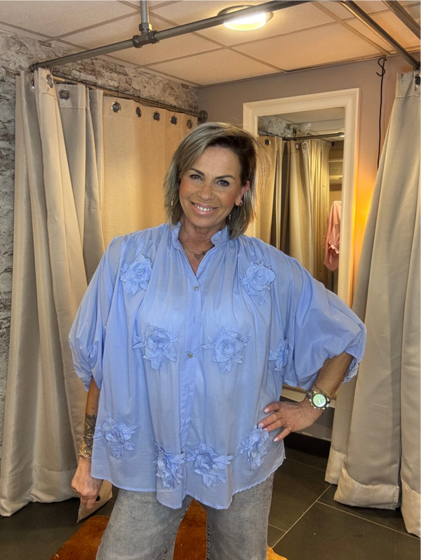 Deze stijlvolle wijde blouse krijgt een unieke en luxe uitstraling door de opgenaaide bloemen op het voorpand. De subtiele 3D-details geven de blouse nét dat beetje extra en maken het een echte eyecatcher.