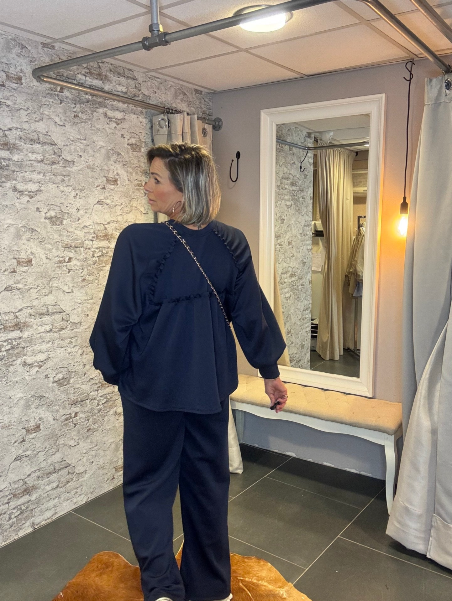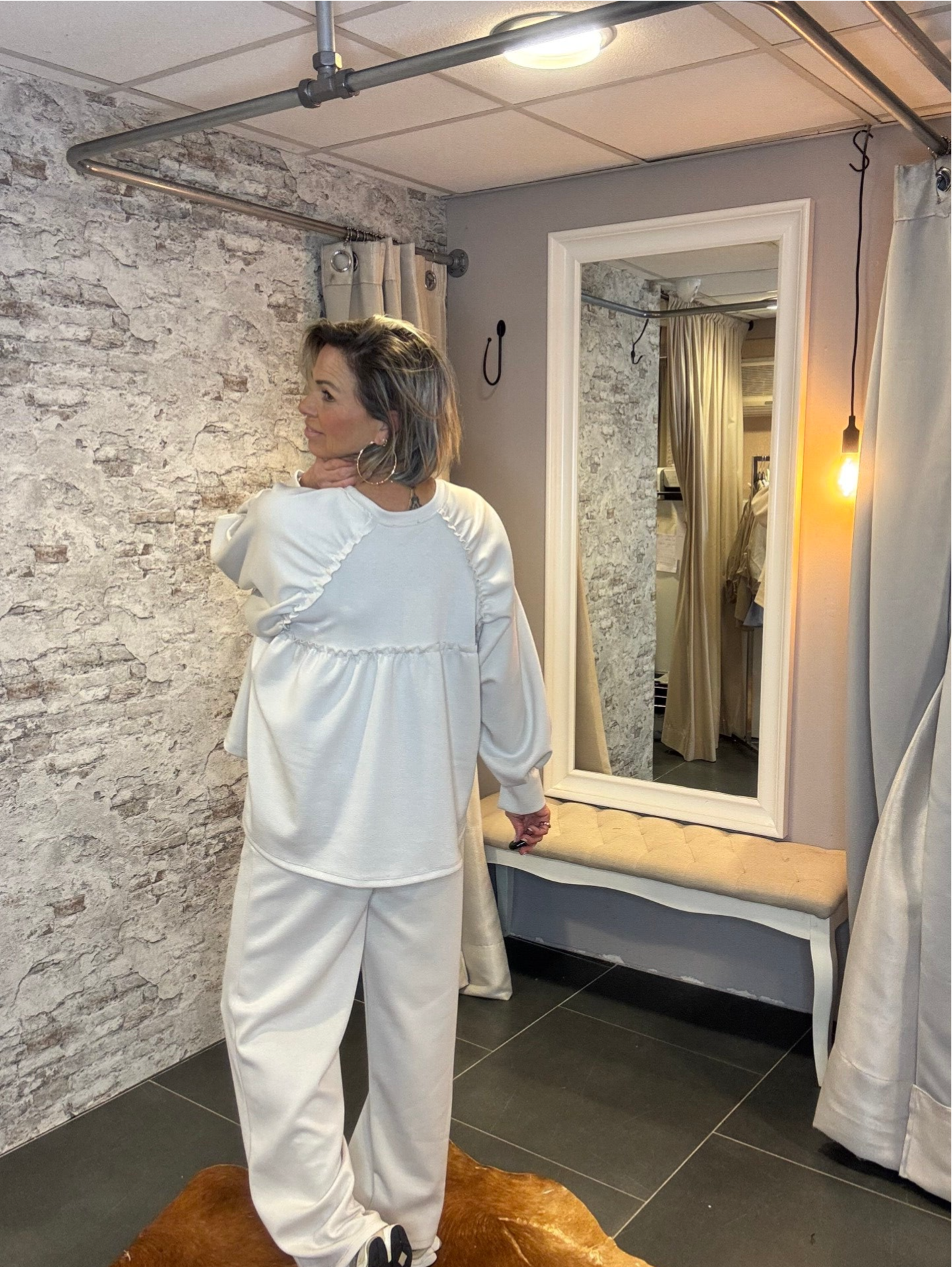 De top is speels afgewerkt met een kortere voorkant en een langer achterpand. Op de achterkant zit een leuk detail dat de set net dat beetje extra geeft. De lange mouwen met een split in de manchetten zorgen voor een stijlvolle en moderne touch.